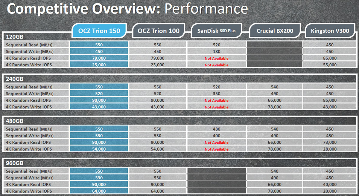 For its “competitive overview” presentation slide, OCZ is comparing the Trion 150 series (15-nanometer TLC NAND flash) against its previous Trion 100 series (Advanced 19-nanometer TLC NAND flash), along with the SanDisk SSD Plus (Advanced 19-nanometer MLC NAND flash), the Crucial BX200 (16-nanometer MLC NAND flash), and the Kingston V300 (20-nanometer MLC NAND flash). Therefore, makes sense to compare any performance-per-dollar ratings with these particular drives in mind. We will be focusing particularly on 480GB capacity variants.