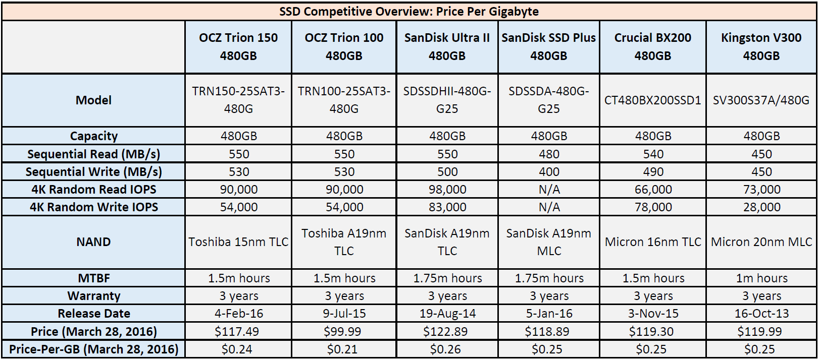 SSD Competitive Overview: Price-Per-Gigabyte as of March 28, 2016 (Larger image here.)