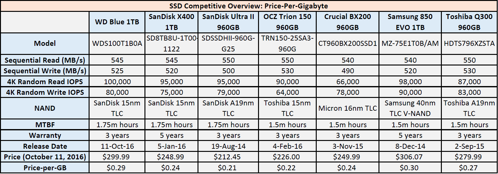 Our chart lists some of the highest performing solid state drives over the past 30 months, with the SanDisk Ultra II 960GB coming in at a low $212.45 ($0.21 per-gigabyte), followed by the OCZ Trion 150 960GB at $226, and the SanDisk X400 1TB and Crucial BX200 960GB at $248.99 and $249.99, respectively. There is a noticeable $30 price jump to the Toshiba Q300 at $279.99, while at the top of the list are the WD Blue 1TB and Samsung 850 EVO 1TB with similar prices of $299.99 and $306.07, respectively.
