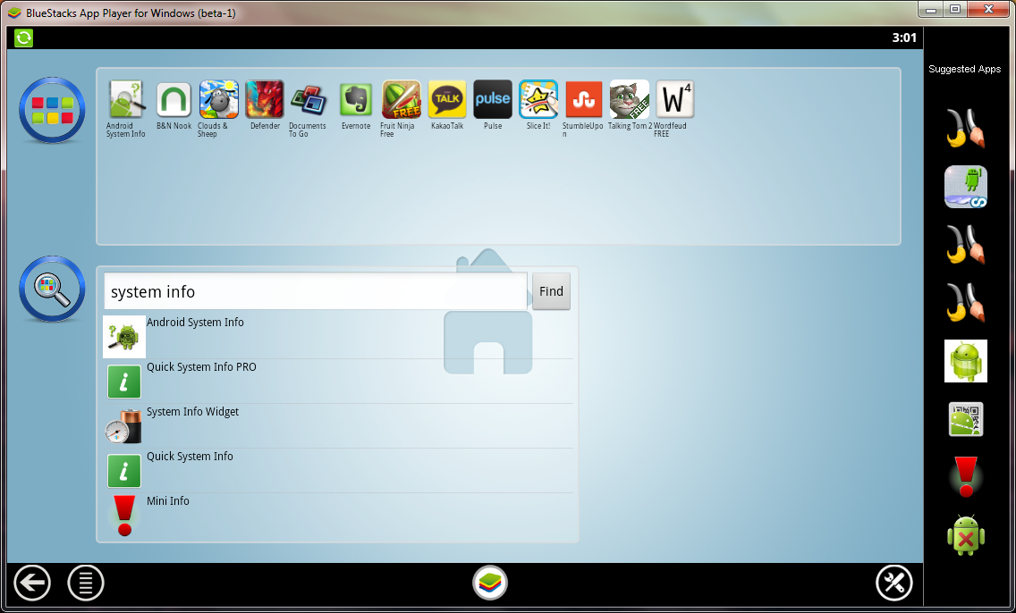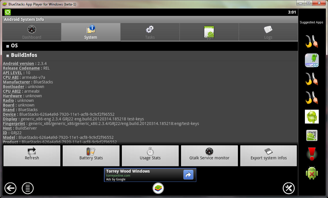 Of course, we were curious to see the System Information details after the emulator was installed. We downloaded Android System Info from the Android App Store and quickly discovered that BlueStacks is emulating Android 2.3.4 Gingerbread for ARM v7 processors (ARM Cortex-A, ARM Cortex-M, ARM Cortex-R).