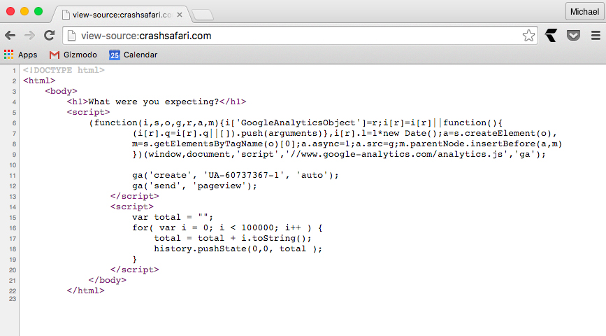The website, crashsafari.com [update: now taken offline, source code available below], was created to do just what the URL name promises. With four lines of HTML beginning with the header “What were you expecting?”, it can run a script that is able to crash the iPhone’s default browser.