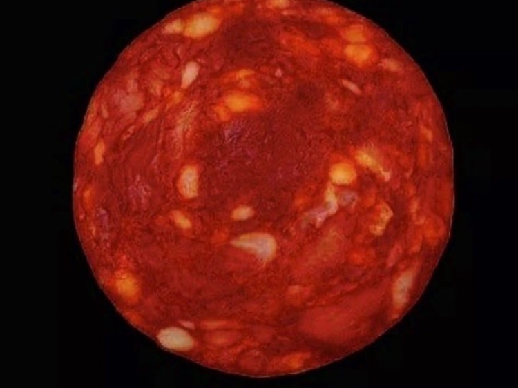 Physicist Etienne Kelin uploaded a photo of a slice of Chorizo, claiming it to be a "photo of Proxima Centauri, the closest star to the Sun, located 4.2 light years from us." The image shows a black, space-like background behind a red object of swirling colours, strange-looking 'gases', and odd markings.