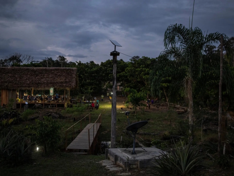 In April, seven months after Starlink's arrival, more than 200 Marubo gathered in a village for meetings. Enoque brought a projector to show a video about bringing Starlink to the villages.