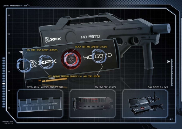 The card will be enclosed inside a case shaped like a P-90 submachine gun which is a nice addition to the overall look and feel of the card, but you should think twice before trying to board a plane with this baby in your bag. For those that managed to miss the info regarding XFX's HD 5970 Black Edition, we are talking about dual-GPU card. Each GPU will work at the same clocks as the HD 5870, so you'll have a card that is tuned to work at 850MHz for each GPU and 4800MHz for a total 4GB of GDDR5 memory, 2GB for each GPU.