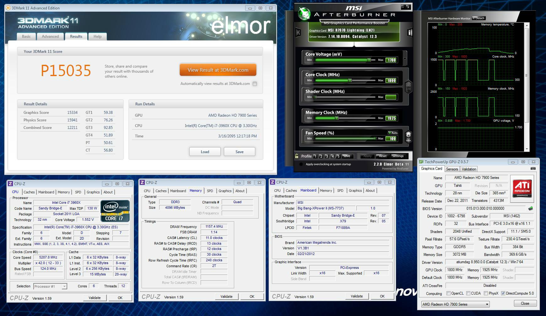 The cards was normally chilled by LN2 and stable core clock ended up at 1800MHz with 1700mV of voltage. Memory ended up at impressive 1925MHz (7.7GHz effective). Elmor used MSI's Big Bang XPower II X79 motherboard and Intel Core i7 3960X Sandy Bridge-E CPU overclocked to 5207.8MHz. The 3DMark 11 score ended at 15035 marks in Performance mode.