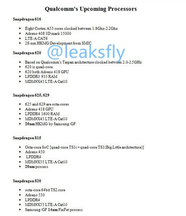 For example, the Snapdragon 616 is supposed to use an unspecified 28nm HKMG node, while the Snapdragon 625 and 629 are based on a 20nm HKMG process, courtesy of Samsung and GlobalFoundries. The Snapdragon 815 also uses a 20nm node, but the leak doesn’t say which one. Lastly, the Snapdragon 820 is said to be based on Samsung’s and GloFo’s new 14nm FinFET process.