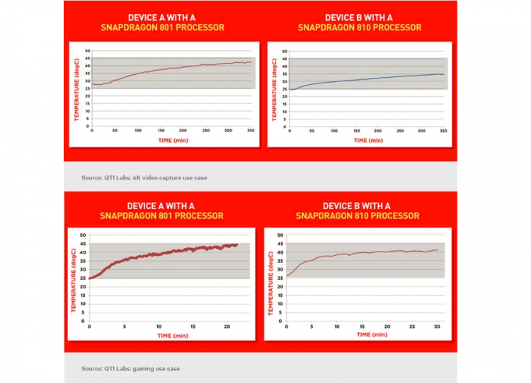 In the gaming test, running Asphalt 8, the new Snapdragon 810 ended up at about 40°C, approximately 5°C cooler than the Snapdragon 801. In the 4K video capture test, the gap was somewhat wider, 35°C versus 43°C in favour of the Snapdragon 810.