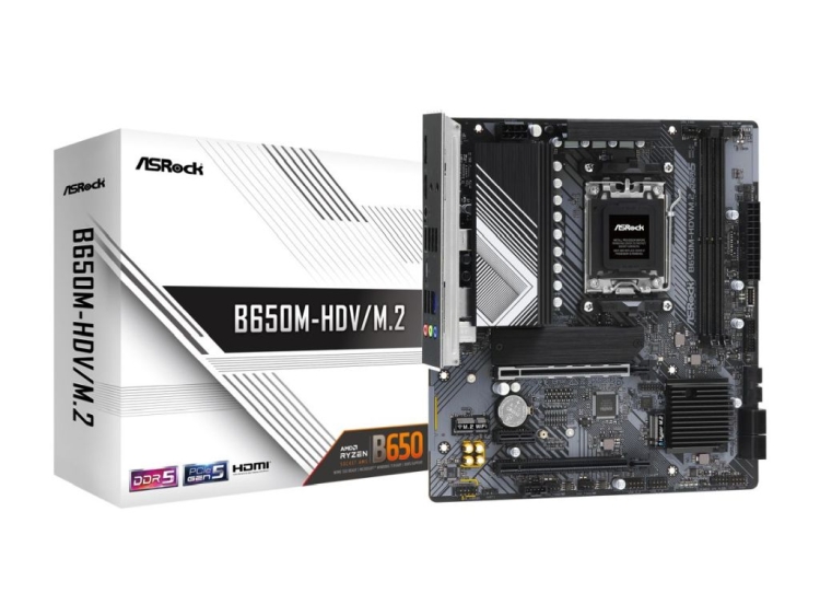 The ASRock B650M-HDV/M2 is a microATX motherboard with support for Ryzen 7000 series CPUs, up to 64GB of DDR5-6400+ memory in two DIMM slots, and has an 8+2+1 Dr.MOS VRM. Since it is based on a standard B650 chipset, it is limited to PCIe 4.0 x16 slot for graphics, but has single PCIe Gen5x4 M.2 slot.