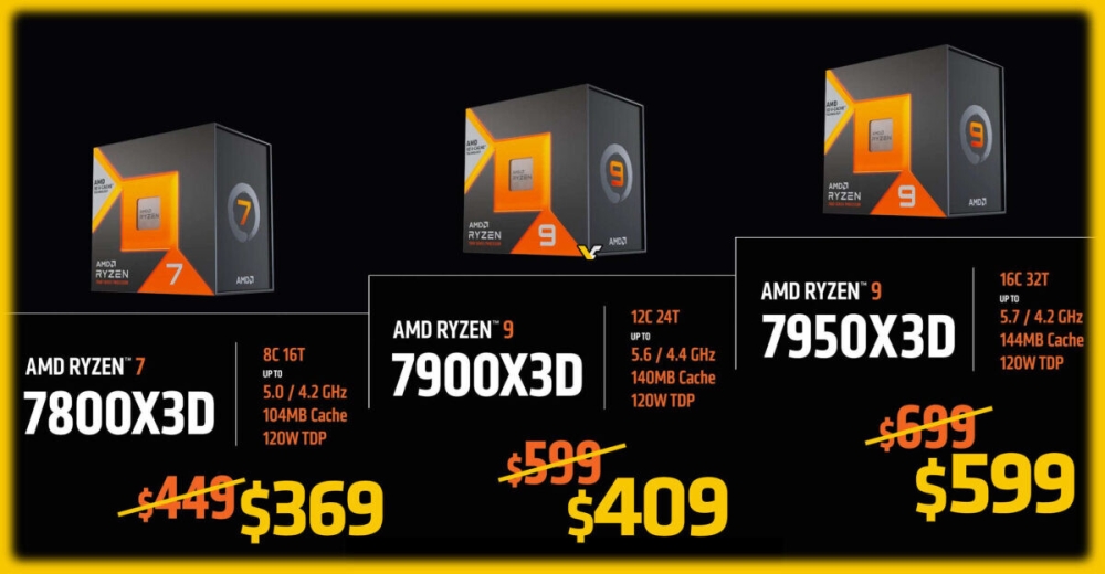 As detailed by Videocardz.com, AMD's Ryzen 7000X3D lineup has dropped in price significantly since the launch, and at $409.99, the Ryzen 9 7900X3D is a great deal considering it is close to the Intel Core i7-14700K. The flagship Ryzen 9 7950X3D is now selling at $599, while the Ryzen 7 7800X3D, an 8-core/16-thread SKU, has dropped down to $369.