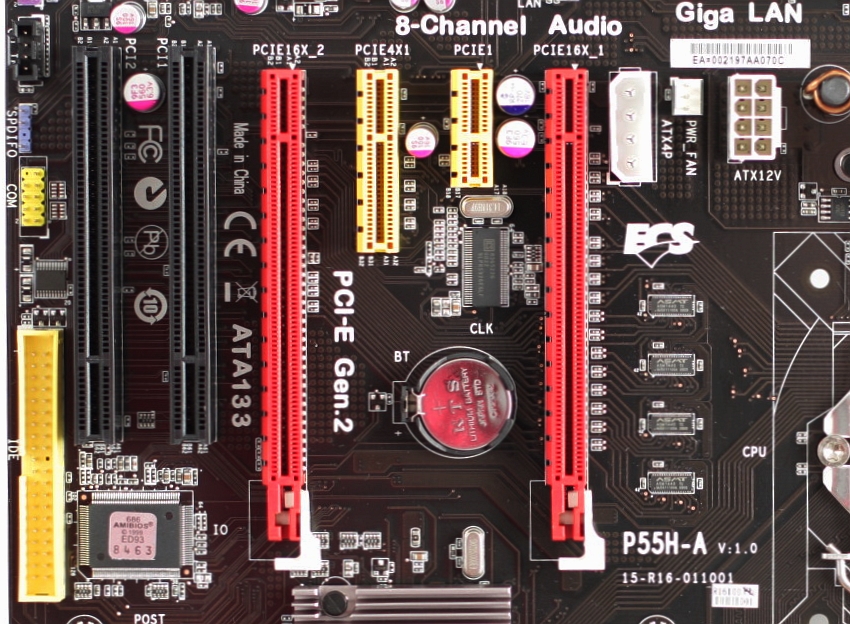 The slot design is very straightforward. Two PCIe 2.0 x16 slots give you the capability to use Crossfire. This board will not support SLI. The PCIe x4 slot will not be available, if you are using two two-slot PCIe graphics cards. For some reason Elitegroup decided to place a 4-pin molex-connector on the board, which is totally unnecessary and so it loses one PCIe slot.