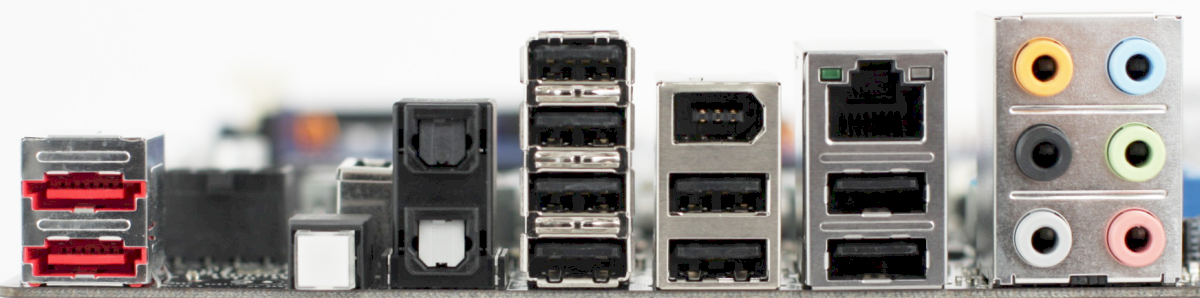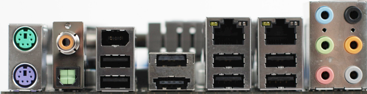 Intel is the only vendor not using some cheap Gb solution, but of course they produce them themselves. So an i82578DC controller gives you good connection. On the other hand Intel uses an outdated PCI Firewire controller. The audio solution is of course a Realtek and the best they do offer, an ALC889. The extra two SATA ports on board and the two eSATA ports are provided by a Marvell controller.