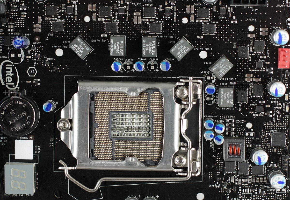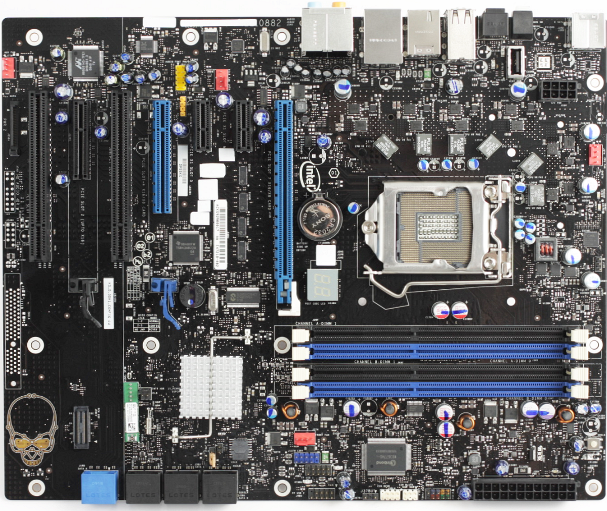 Intel is the only company still way back in the last century, as they do not offer one board with solid cap design nor using high end parts on all components. For what they offer, you pay way to much. Also the design is odd with lots of empty space on the left side and a skull which they think is cool, but it's not. The debug-LED is located behind the first PCIe x16 slot and near the CPU-area. That is the most unintelligent position we can think of, because the view of the LED is most certainly blocked by any highend cooling solution and we don't know anyone who does use the boxed CPU-cooler.