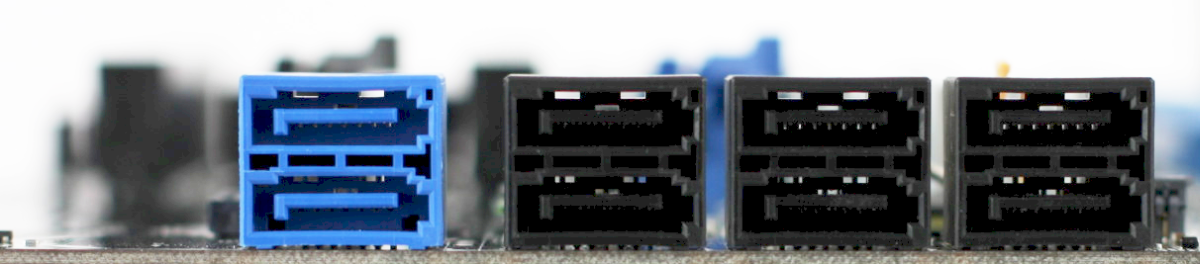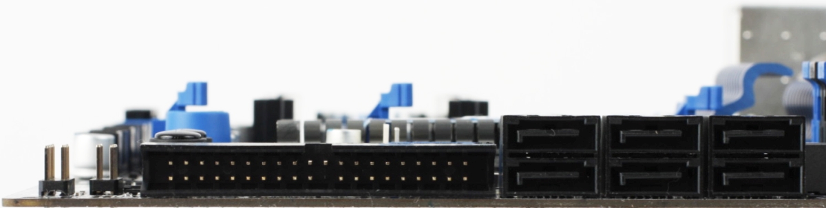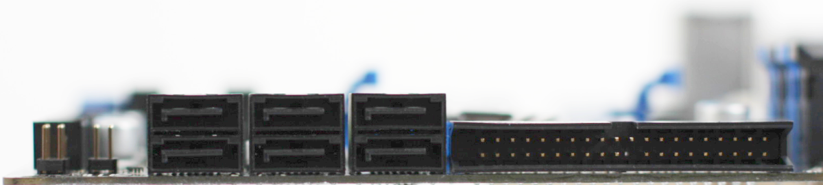 The SATA connectors are on the edge of the board and all of them are angled at 90°. This is the best solution available because the connectors won't interfere with any cards. Sadly the PATA connector is on the left side of the board near the second PCI slot. Meanwhile we would not be sad to see this connector gone.