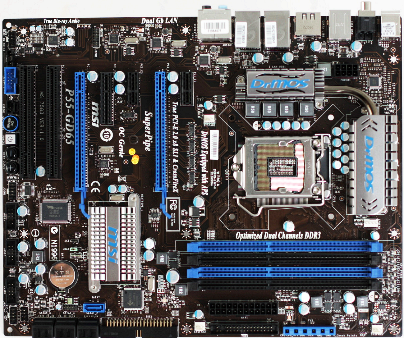 A fast recap of the P55: This is now called Platform Controller Hub, which in fact is a Southbridge. To avoid competition to the X58 platform all eight PCIe 2.0 x1 lanes are crippled to half speed, so you get PCIe 2.0 x0.5. This causes all sorts of problems for vendors who want to integrate USB 3.0 and SATA 6Gbps, at least there is no hard drive which can fully utilize SATA 6Gbps, but for SSDs this feature could be interesting.
