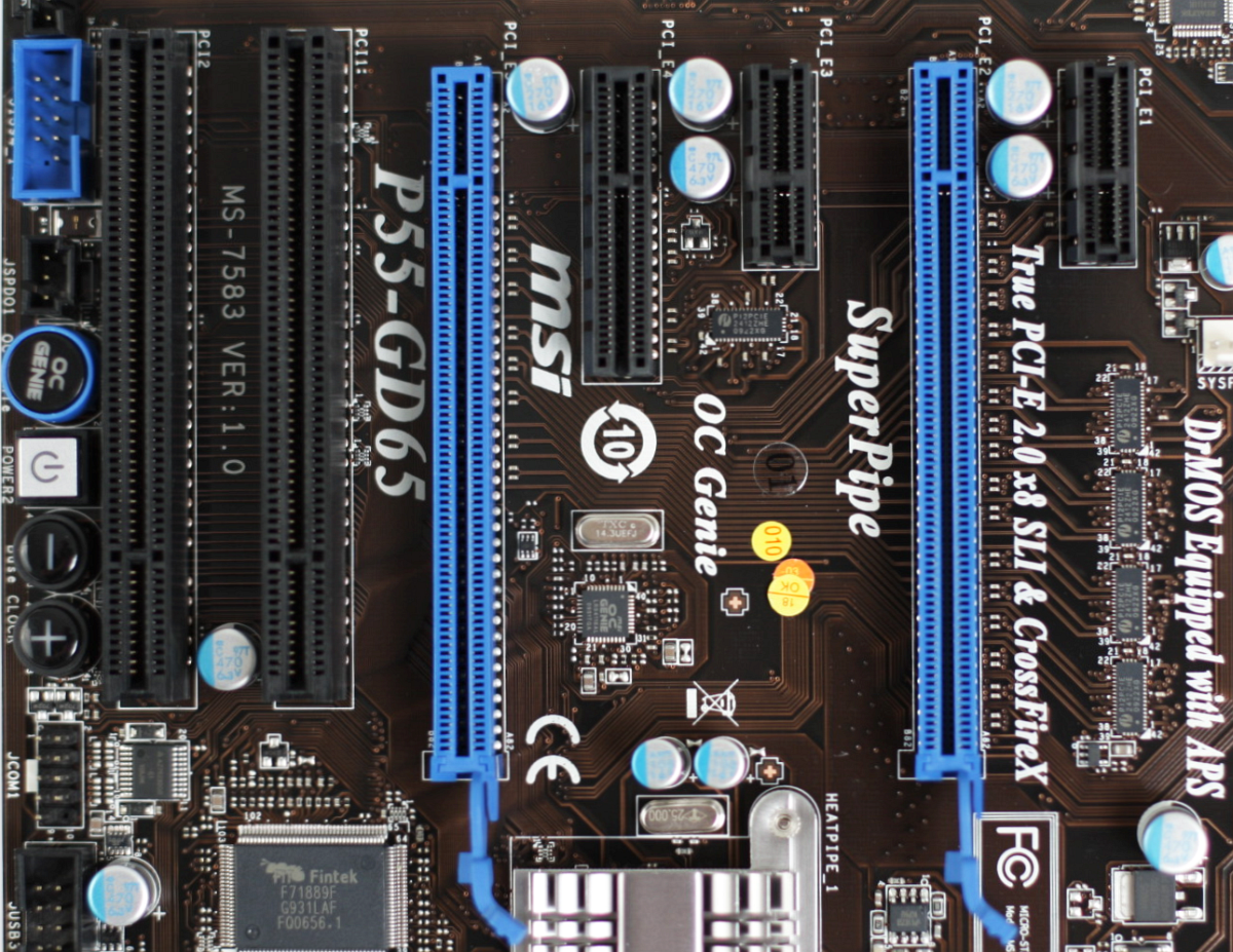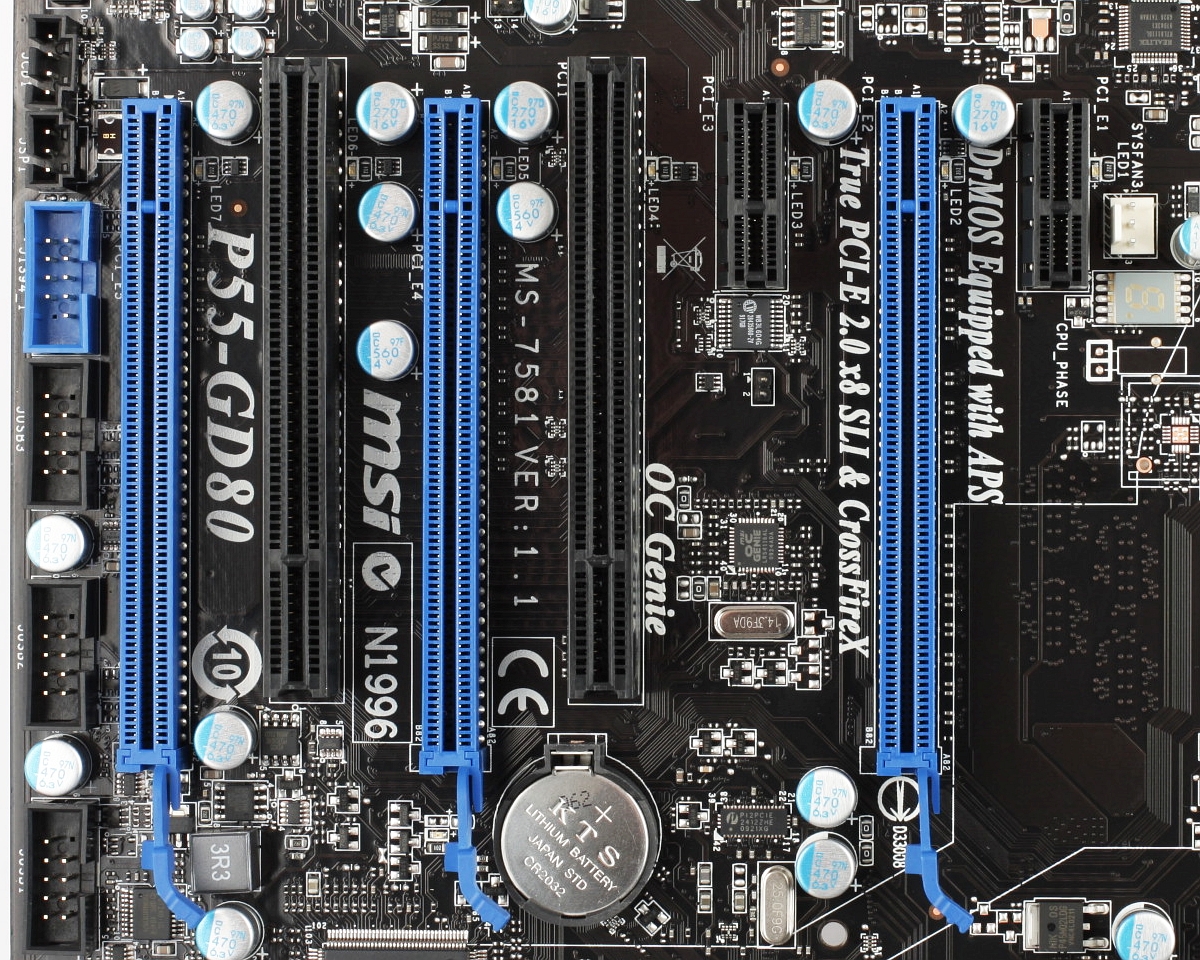 It features a typical MSI slot design, but the addition of one PCIe x1 slot before the first PCIe x16 slot. In constrast to the GD80 version, it's not blocked by an useless cooling solution.