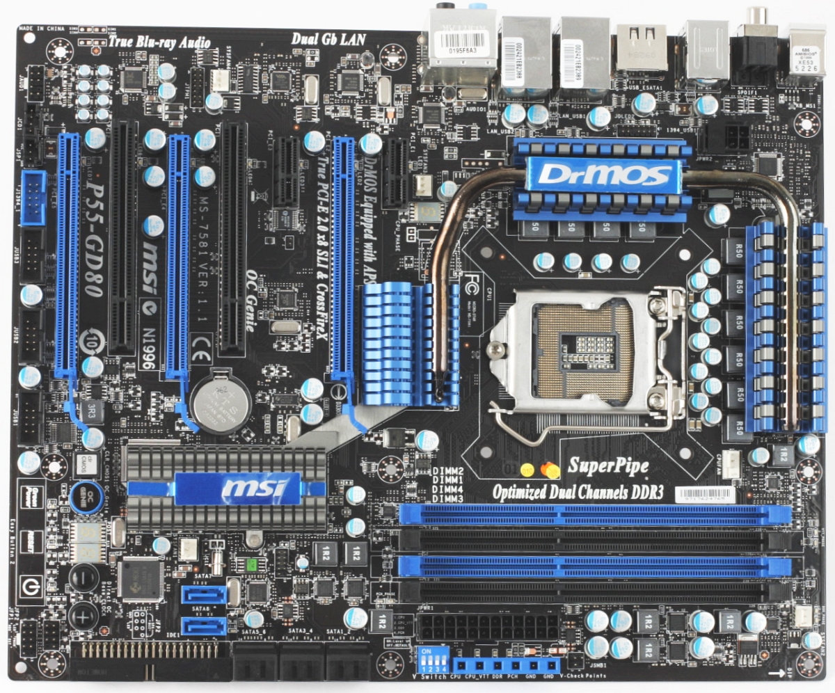 More is not better as MSI proved with the GD80. Three slots are not a wise option with just the P55 chipset, which limits the third PCIe 2.0 x16 slot at x2 speed. Also more phases don't help the board. It does not improve overclocking and increases power-consumption. So for real triple Crossfire or SLI operation the new Trinity will be a better option but at an extremly high price. We also don't like the extremly lame cooling solution with its unnecessary northbridge cooler which does nothing but block the first PCIe x16 slot. The board is available for about €175,-.