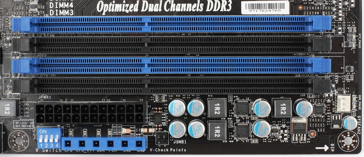 The memory slots are at a safe distance of the CPU socket. Below the memory you find the so-called "V-Check" which makes it possible to measure several voltages directly on the board, as long as you own a multimeter.