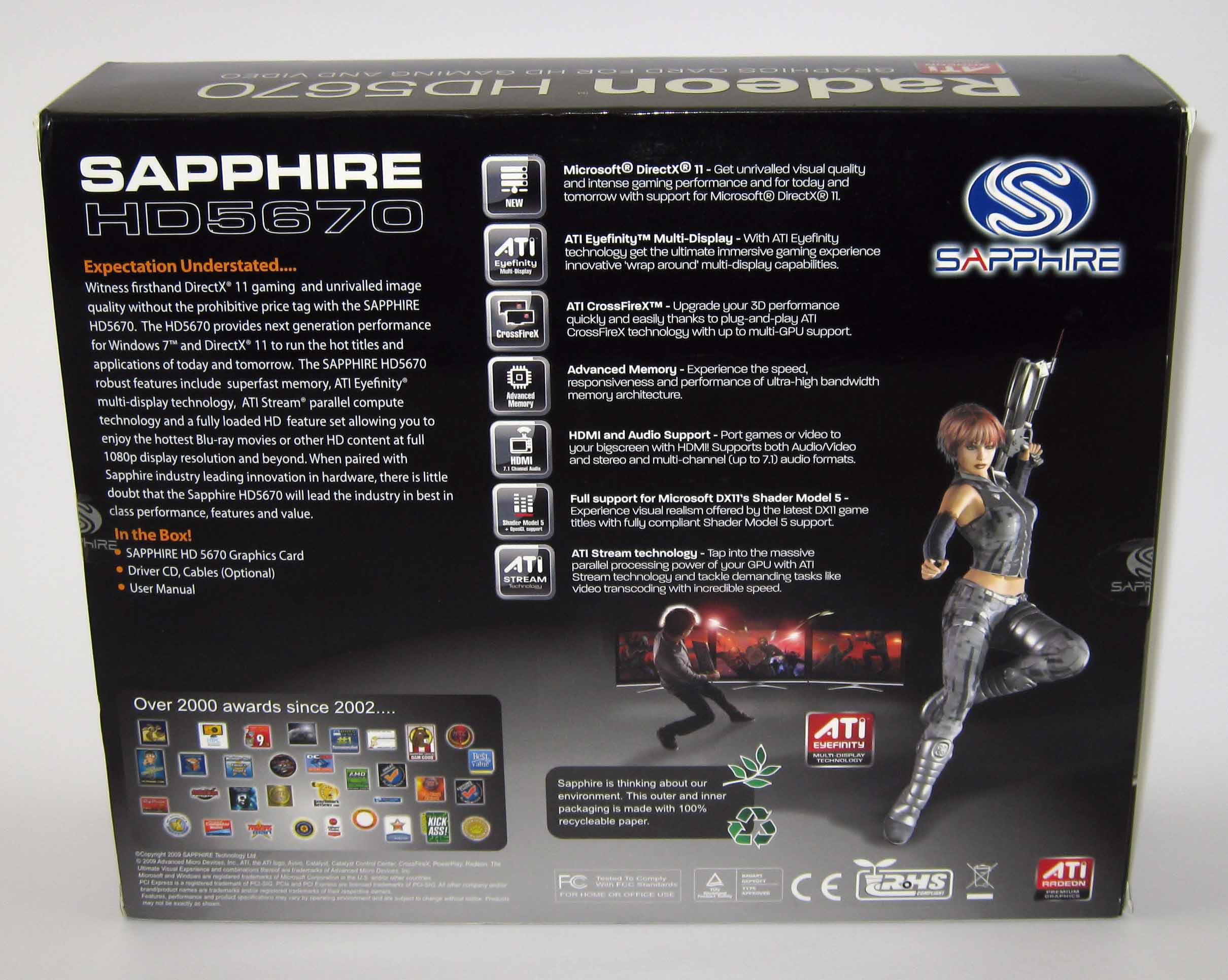 One of the most interesting features on the box is Arctic Cooling’s logo, meaning that Sapphire went a step further and replaced reference cooling with what the box calls a “Cool and Silent” cooler. We’ve already mentioned the HD 5670’s chip and capabilities but let us recap – the card has ATI Eyefinity technology, onboard DisplayPort and HDMI, CrossfireX support, ATI Stream GPU processing support, 1GB of GDDR5, PCI Express 2.0 and DirectX 11 with Shader model 5.