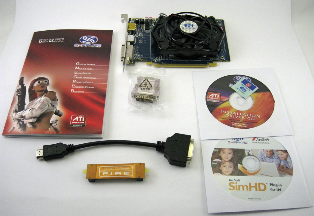 The box is made of recycled paper and is pretty sturdy. The following picture shows the contents – Crossfire connector, driver CD, Sapphire sticker, ArcSoft SimdHD plug-in for IM (which can unfortunately only be used if you install ArcSoft TotalMedia Theatre app), short user’s manual, DVI-to-VGA adapter, the HD 5670 graphics card and the HDMI-to-DVI cable. So, Sapphire made sure you’re pretty much set for any scenario that might occur.