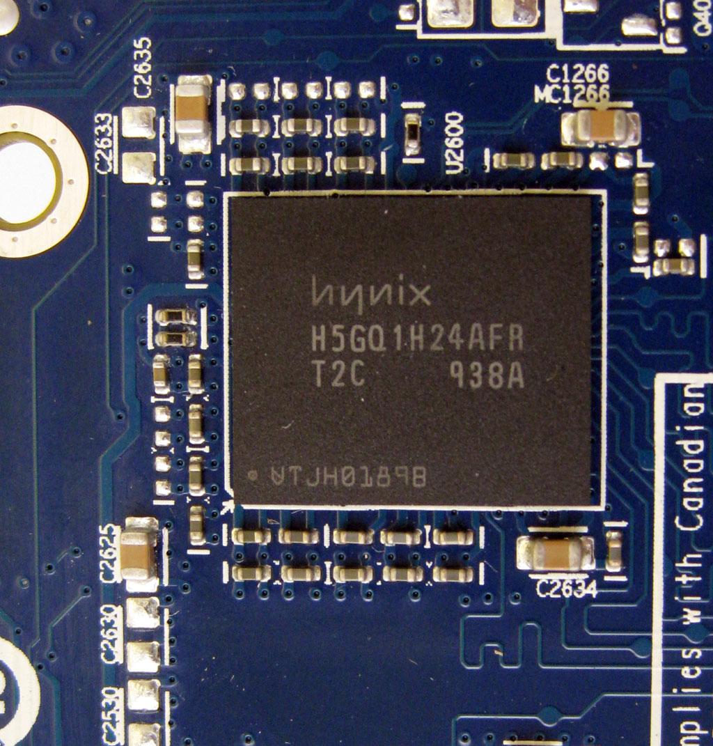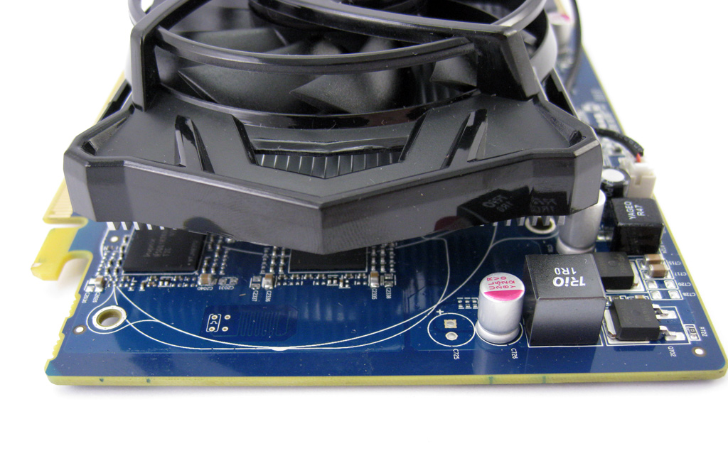 The card features 1GB of memory – 512MB on each side. The following picture shows that the memory on the front is partially cooled by the fan and while that’s not the case on the back of the card, memory temperatures aren’t that high to begin with and thus it doesn’t really require cooling.
