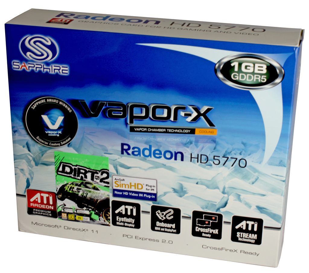 Vapor-X HD 5770 1GB GDDR5 PCI-E DUAL DVI-I/HDMI/DP, which is the card’s full name, comes in sturdy packaging made of recycled paper. The package holds the card, Dirt 2 coupon, driver CD, installation guide, DVI-to-VGA adapter, Molex-to-6 pin cable adapter and a CrossFire connector.
