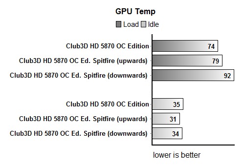The non-reference cooler on Club3D’s HD 5870 OC card kept the GPU temperatures at 74°C, whereas idle temperatures were at 35°C.