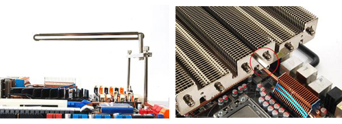 When you have encountered this, you will need to install the supporting bars to the E-ATX mounting holes as circled in red.    And then apply the copper pillar to location on the VGA cooler as circled in red.