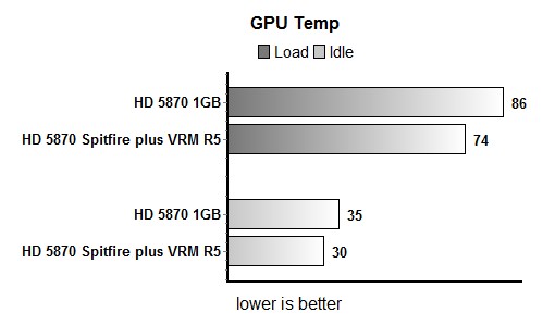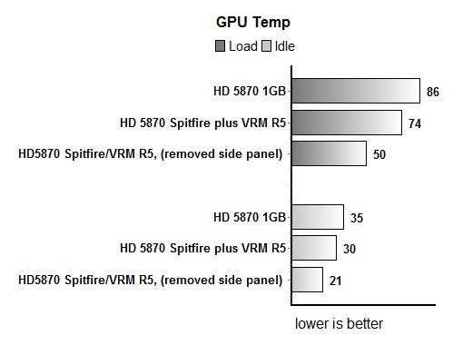 We used the X-Silent 140 fan running at 900 RPM (we left it at max in both 3D and idle scenarios). The fan is almost inaudible, unlike the reference HD 5870, which we also left in auto mode. As you can see, temperature differences during and after our FurMark testing was 11°C. Spitfire was facing upwards (as advised) in all the tests and we used the included Thermalright The Chill Factor thermal paste.