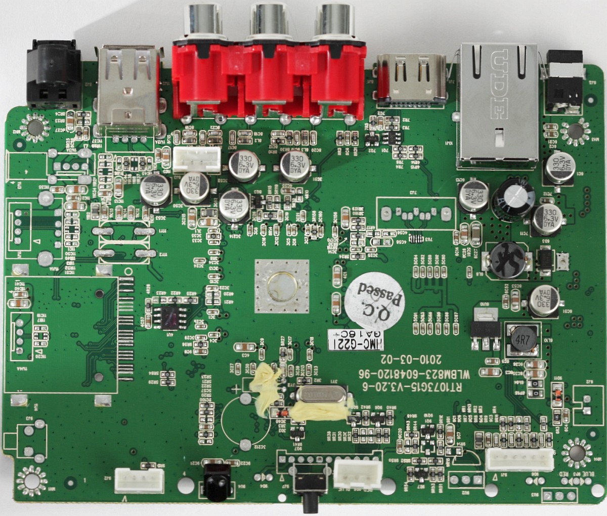 On the back is where the real magic is. The Realtek RTD1073DD is really standing out. As big as an Intel or AMD CPU, this beast has an integrated MIPS core and clocks 400MHz. The 256MB flash-chip holds the firmware and a tiny memory chip makes the box work.