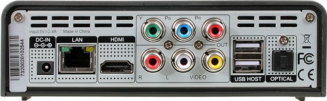 The box has lots of output connectors. The most important is HDMI which supports up to 1920x1200. Besides that you get an optical audio out or a conventional chinch stereo downmix. Also analog video is possible. Besides that, one LAN and two USB 2.0 ports give you plenty of connection options.
