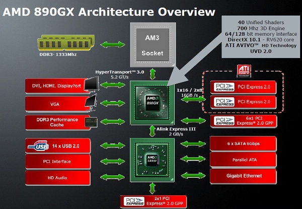 As you can see, it's still pretty straight forward. The 890GX is capable of providing 22 PCIe 2.0 lanes, which results in one x16 and six x1 lanes. The PCIe x16 can be split to two x8 to use two ATI Radeon graphics-cards in Crossfire mode. While the picture states the SB850 has a PATA controller, it's worth noting that board manufacturers use an add-on chip to provide such functionality. We do not really care if such a port is present, because nowadays anything is SATA and optical drives are cheap as chips. The link between IGP and Southbride has been doubled, so 2GB/s is healthy for possible RAID 0 SATA 6Gbps.